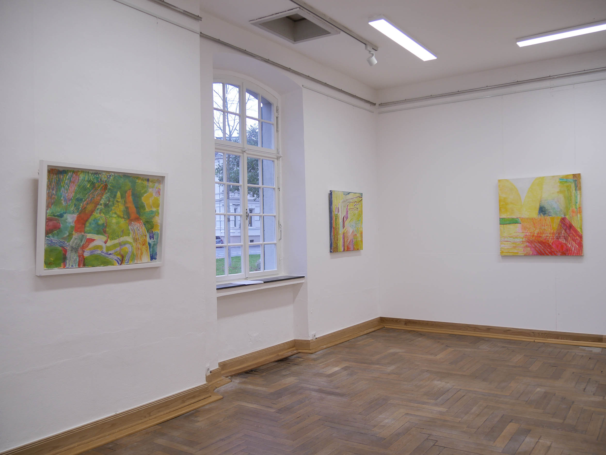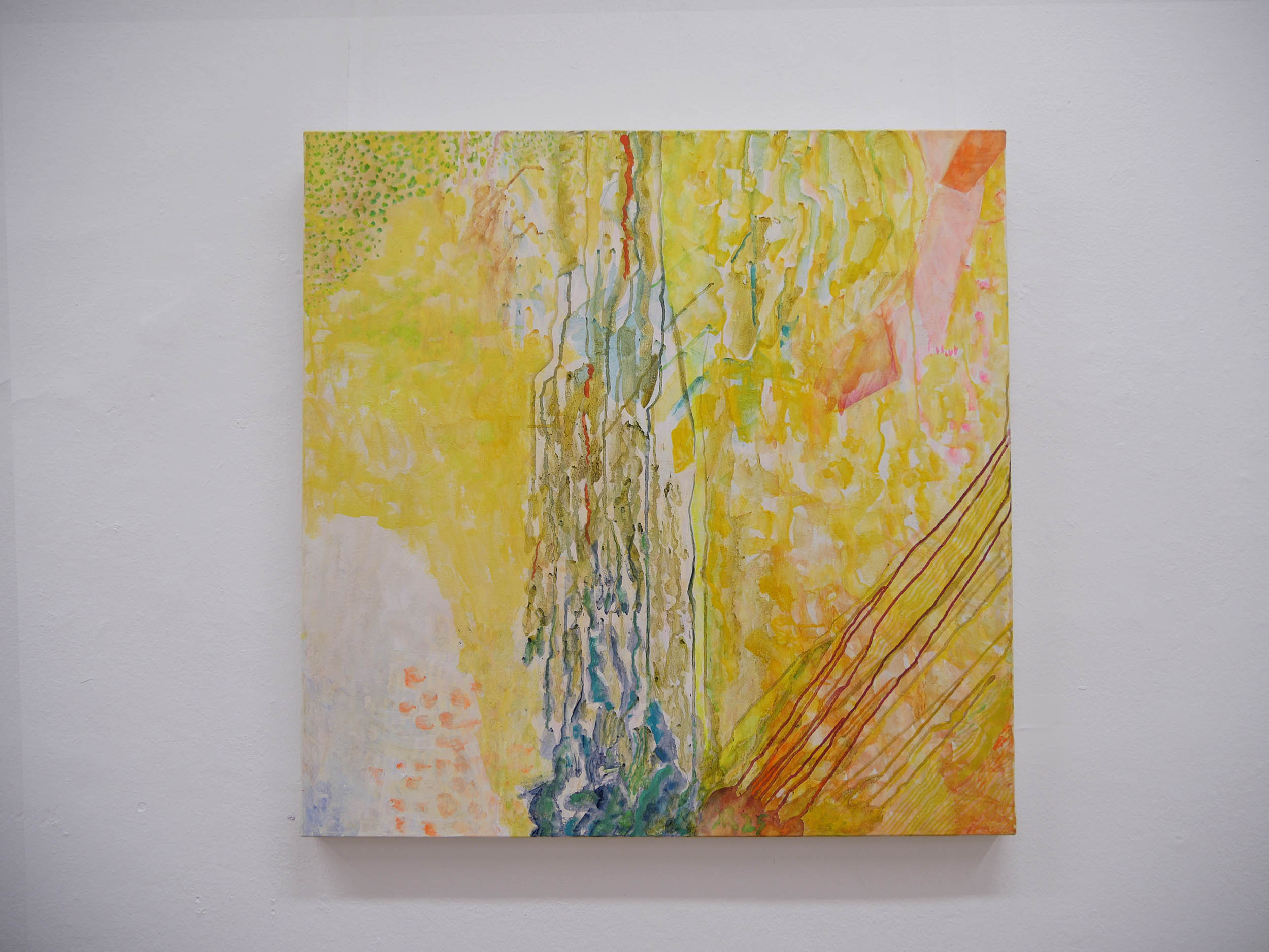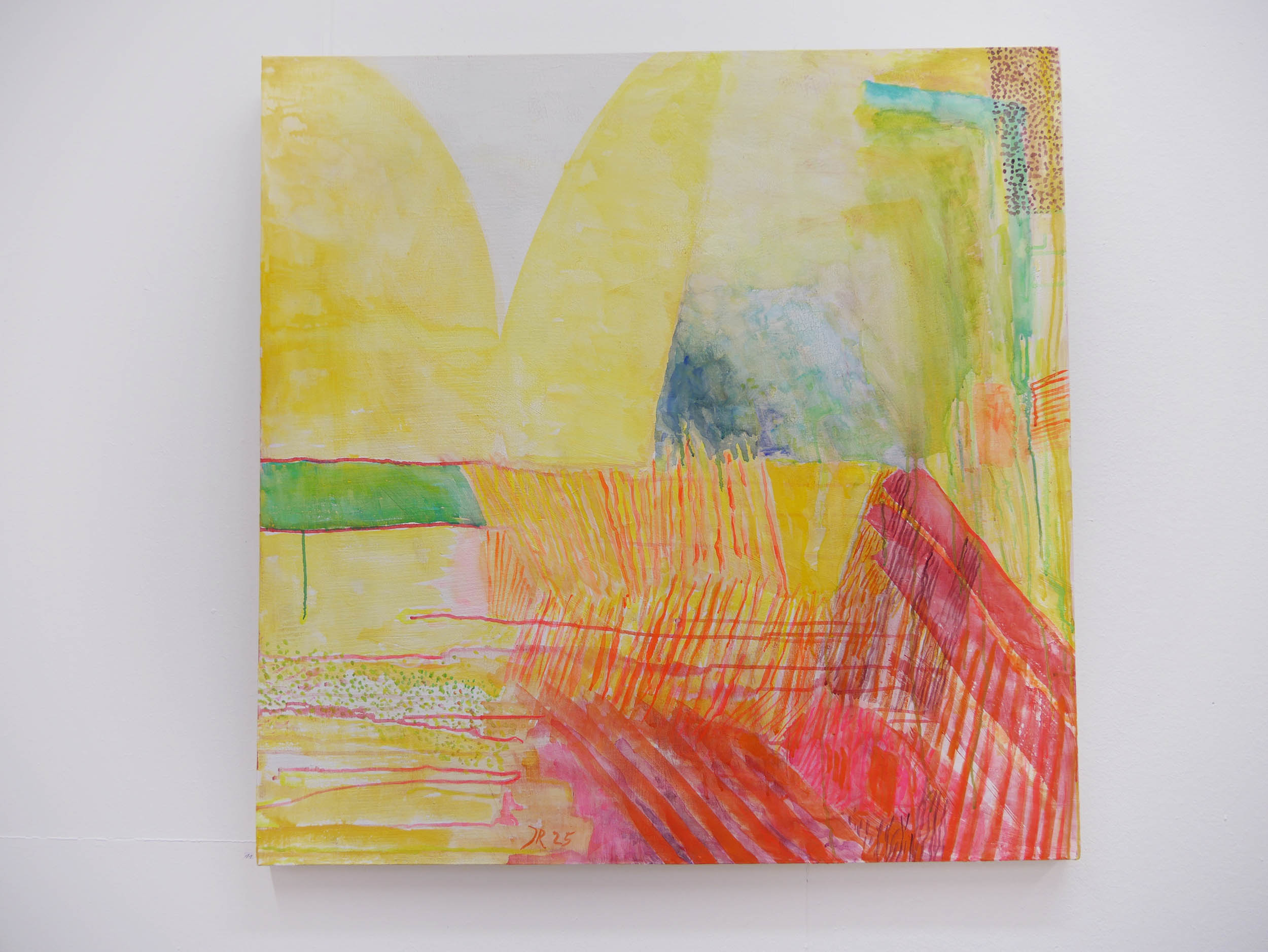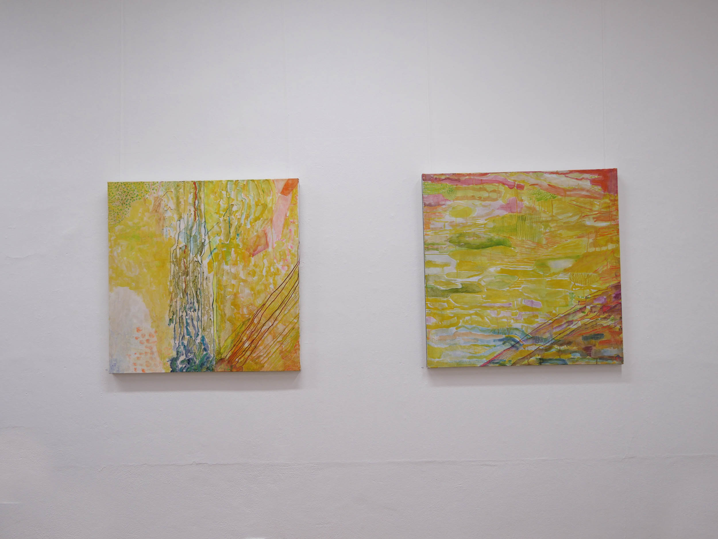 Danach kam eine Phase von Lichteinbrüchen in Gelb, offener, optimistischer. Der Einsatz der Leuchtfarben wird verstärkt, die Arbeiten werden größer und lösen sich von der Landschaft .,Es schleichen sich „Glutnester“ in Orange und Rot ein, die das. transluzente, leuchtende Gelb durchbohren.