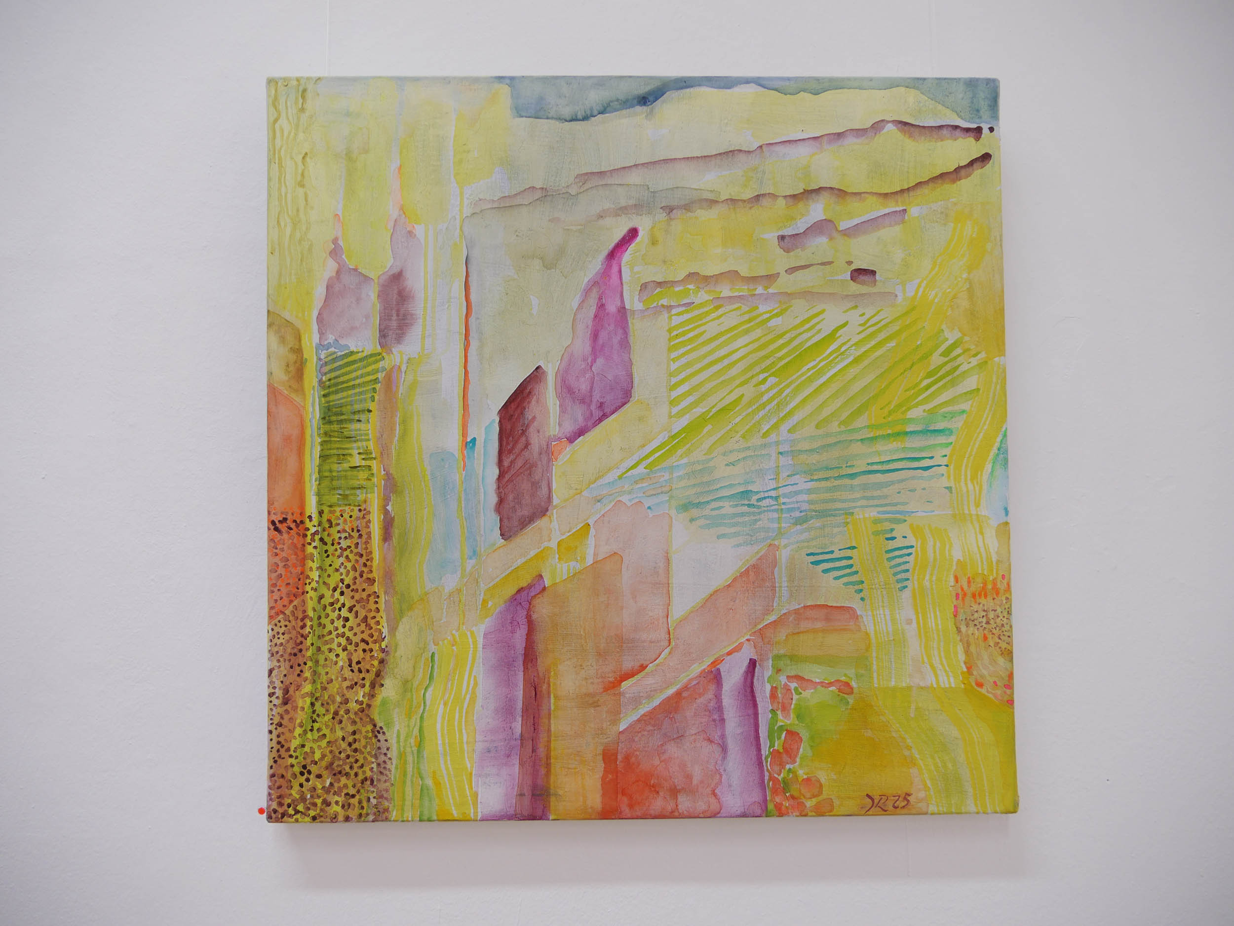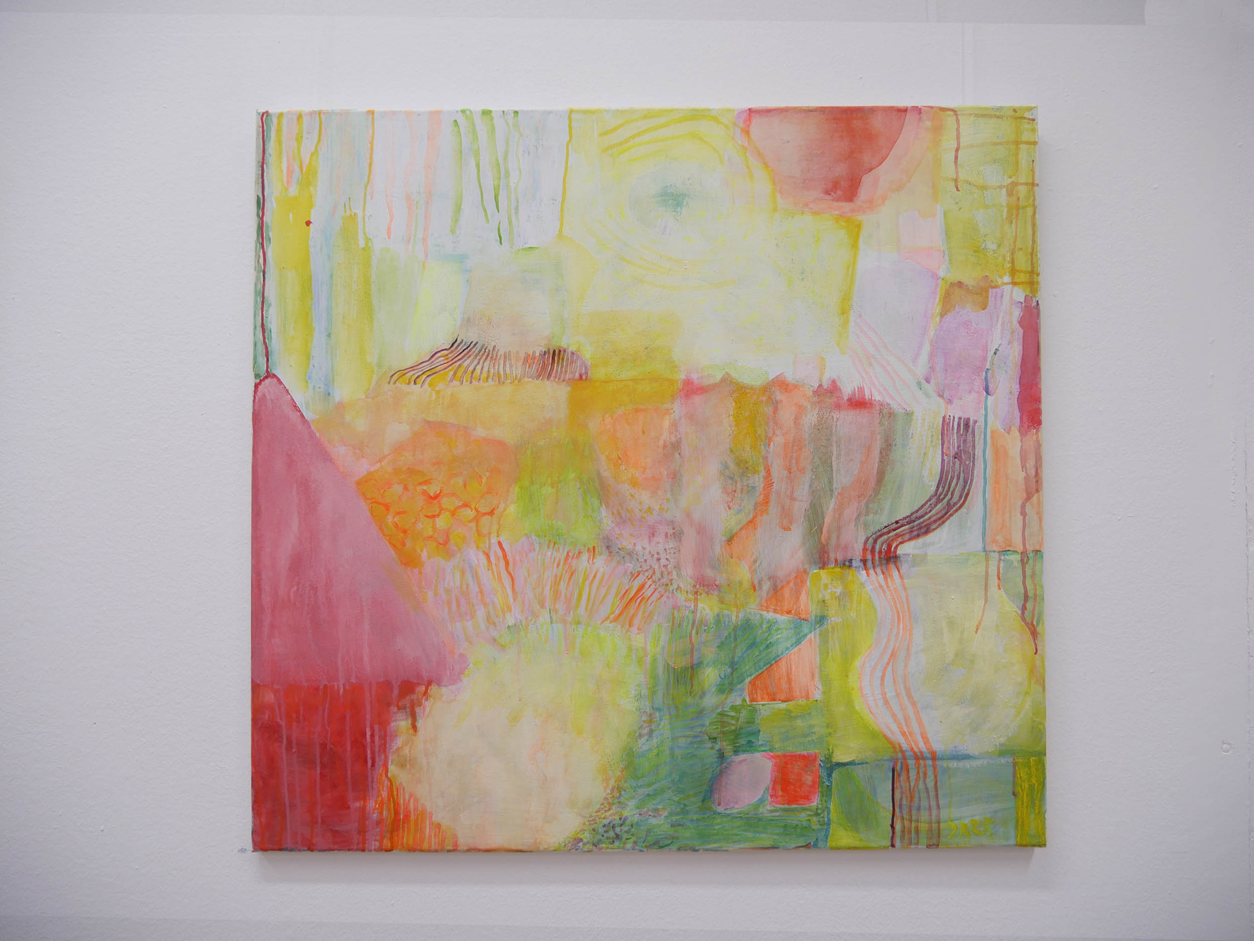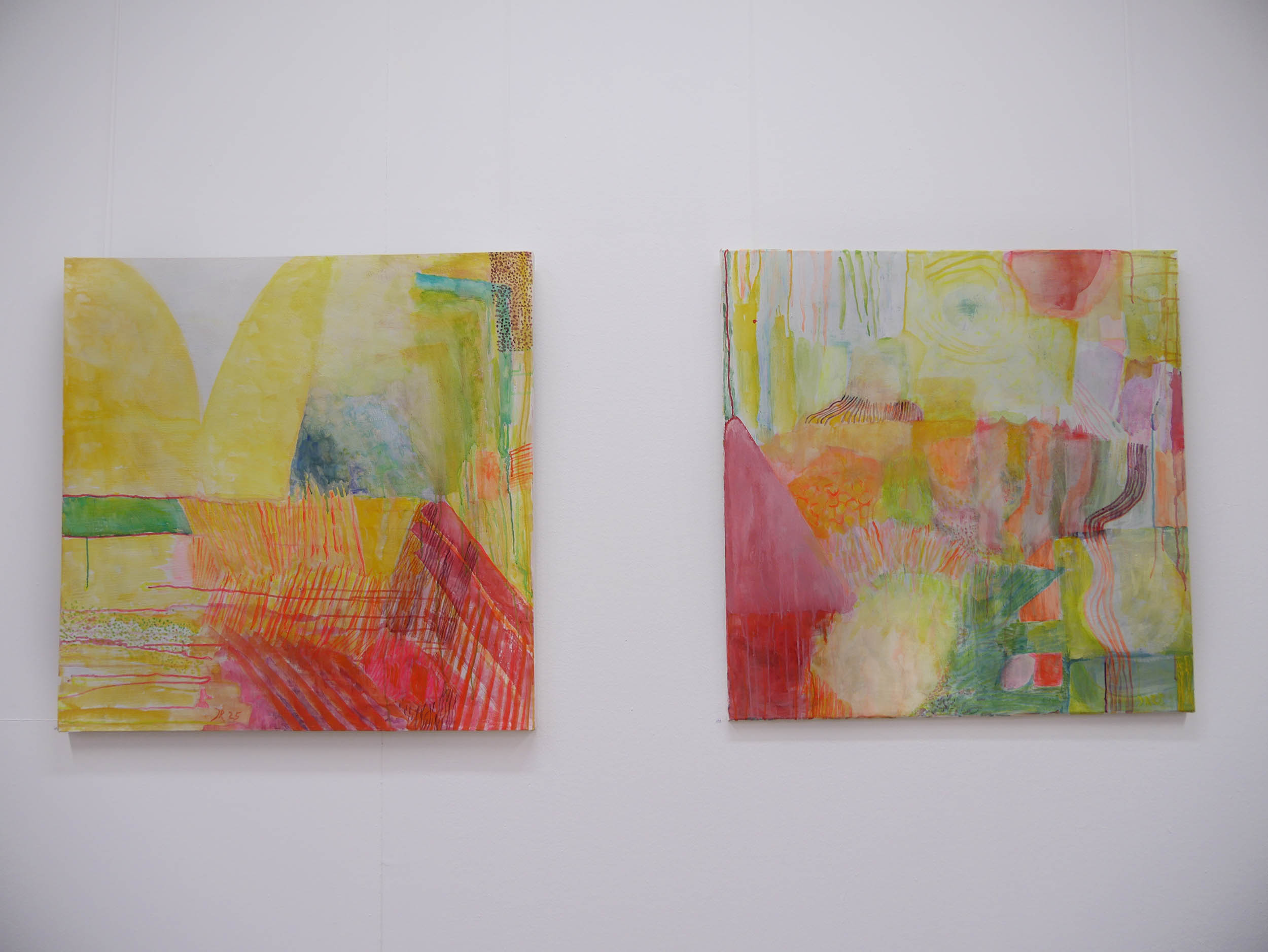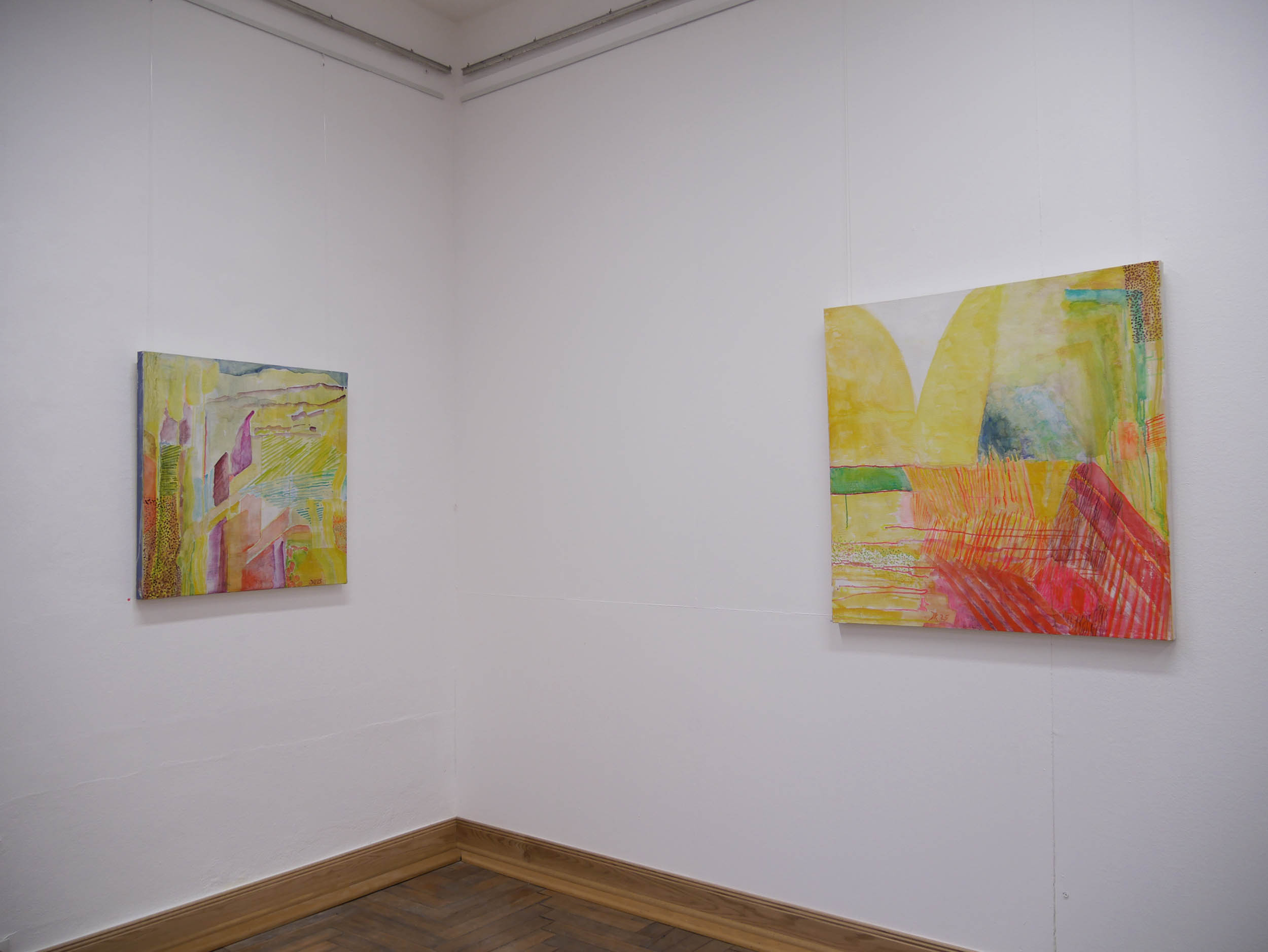 Danach kam eine Phase von Lichteinbrüchen in Gelb, offener, optimistischer. Der Einsatz der Leuchtfarben wird verstärkt, die Arbeiten werden größer und lösen sich von der Landschaft .,Es schleichen sich „Glutnester“ in Orange und Rot ein, die das. transluzente, leuchtende Gelb durchbohren.