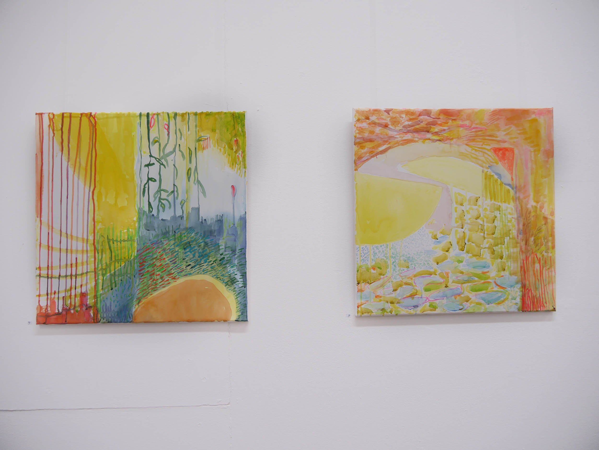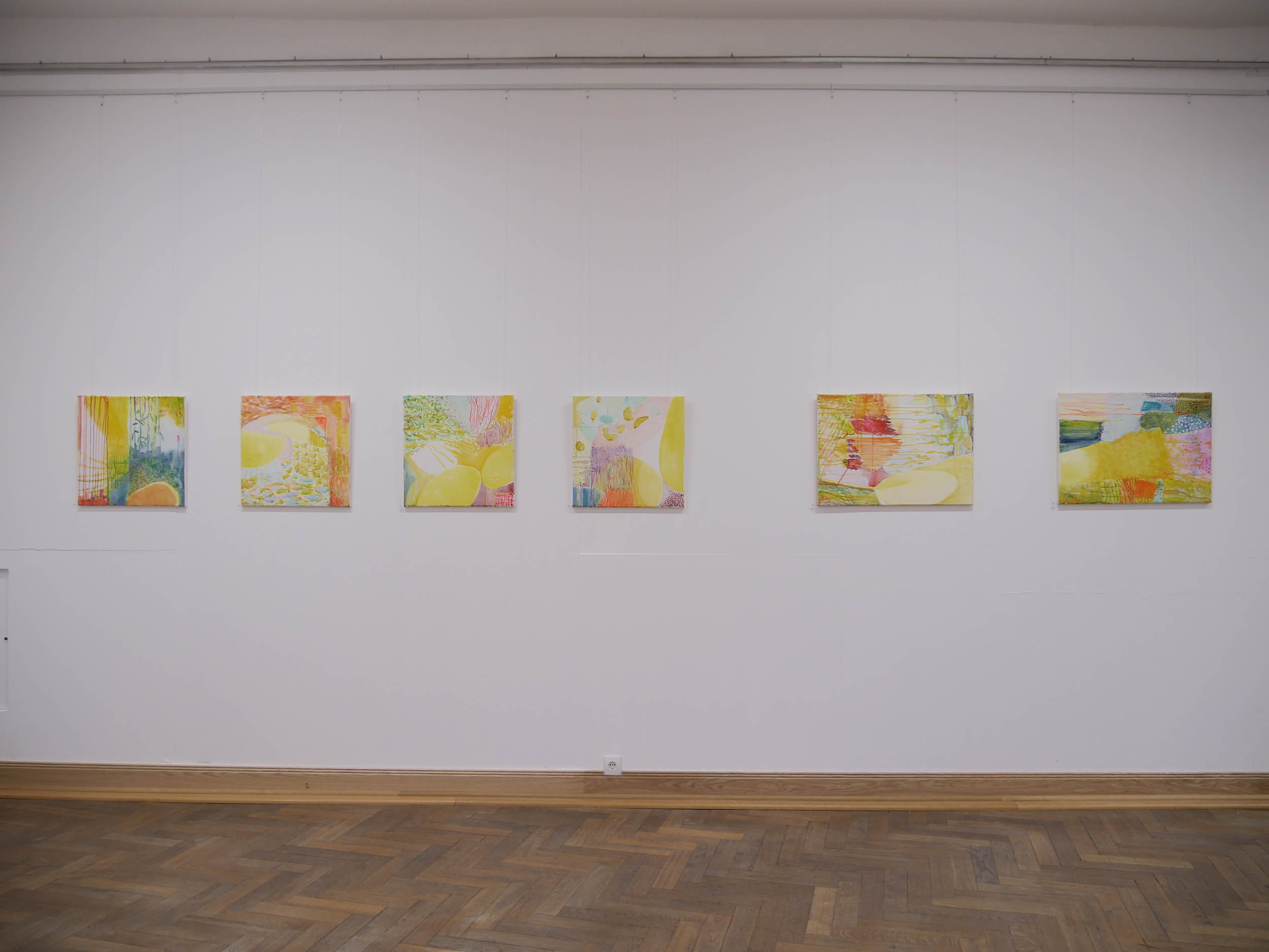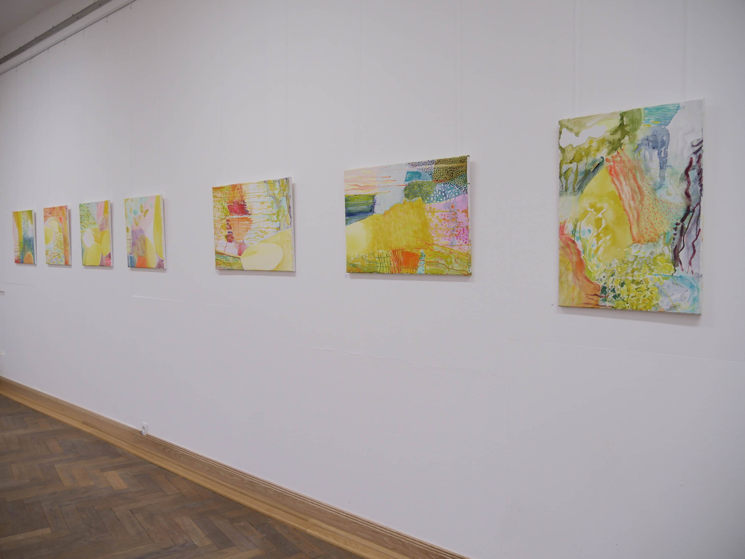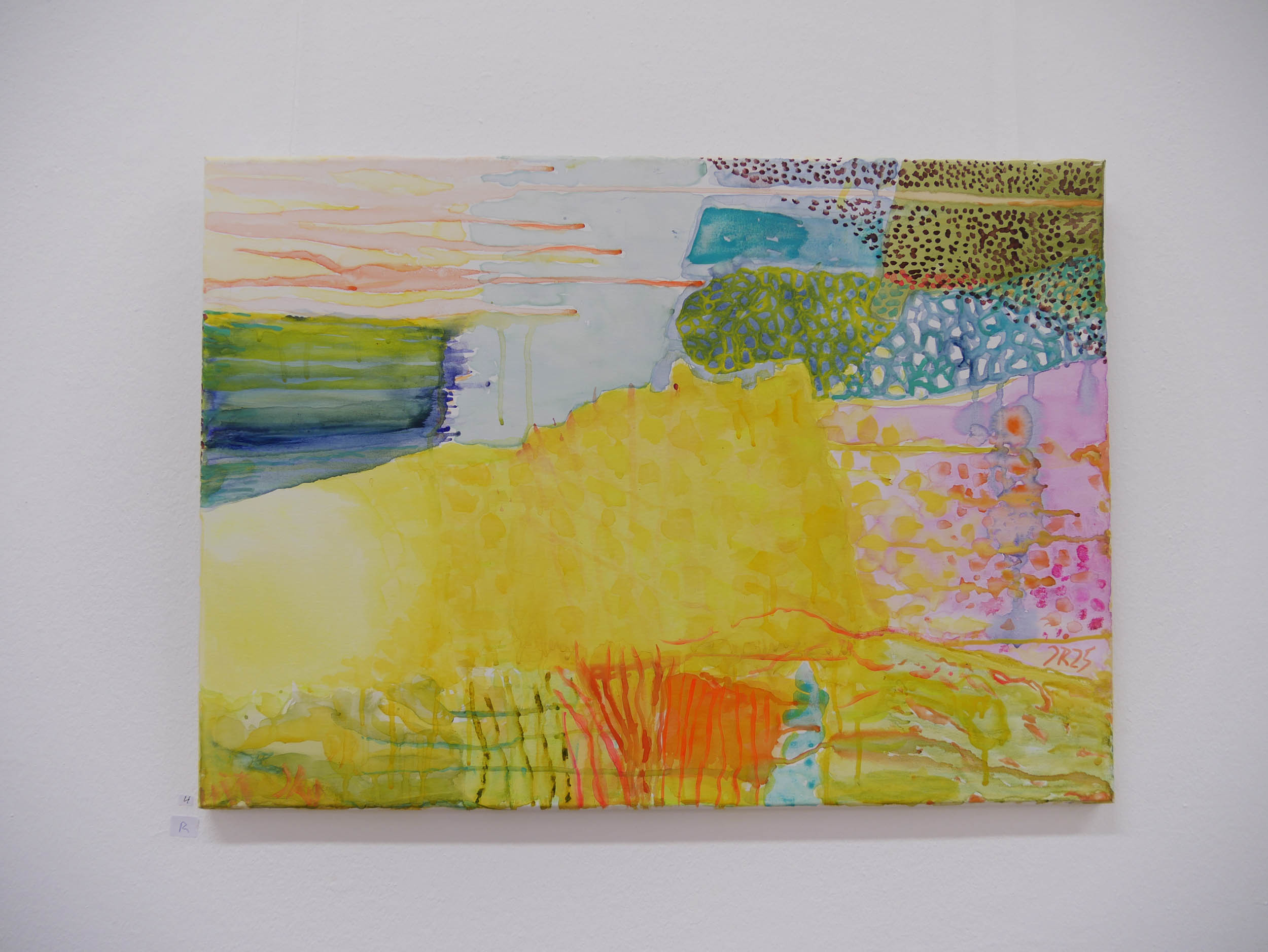 Danach kam eine Phase von Lichteinbrüchen in Gelb, offener, optimistischer. Der Einsatz der Leuchtfarben wird verstärkt, die Arbeiten werden größer und lösen sich von der Landschaft .,Es schleichen sich „Glutnester“ in Orange und Rot ein, die das. transluzente, leuchtende Gelb durchbohren.