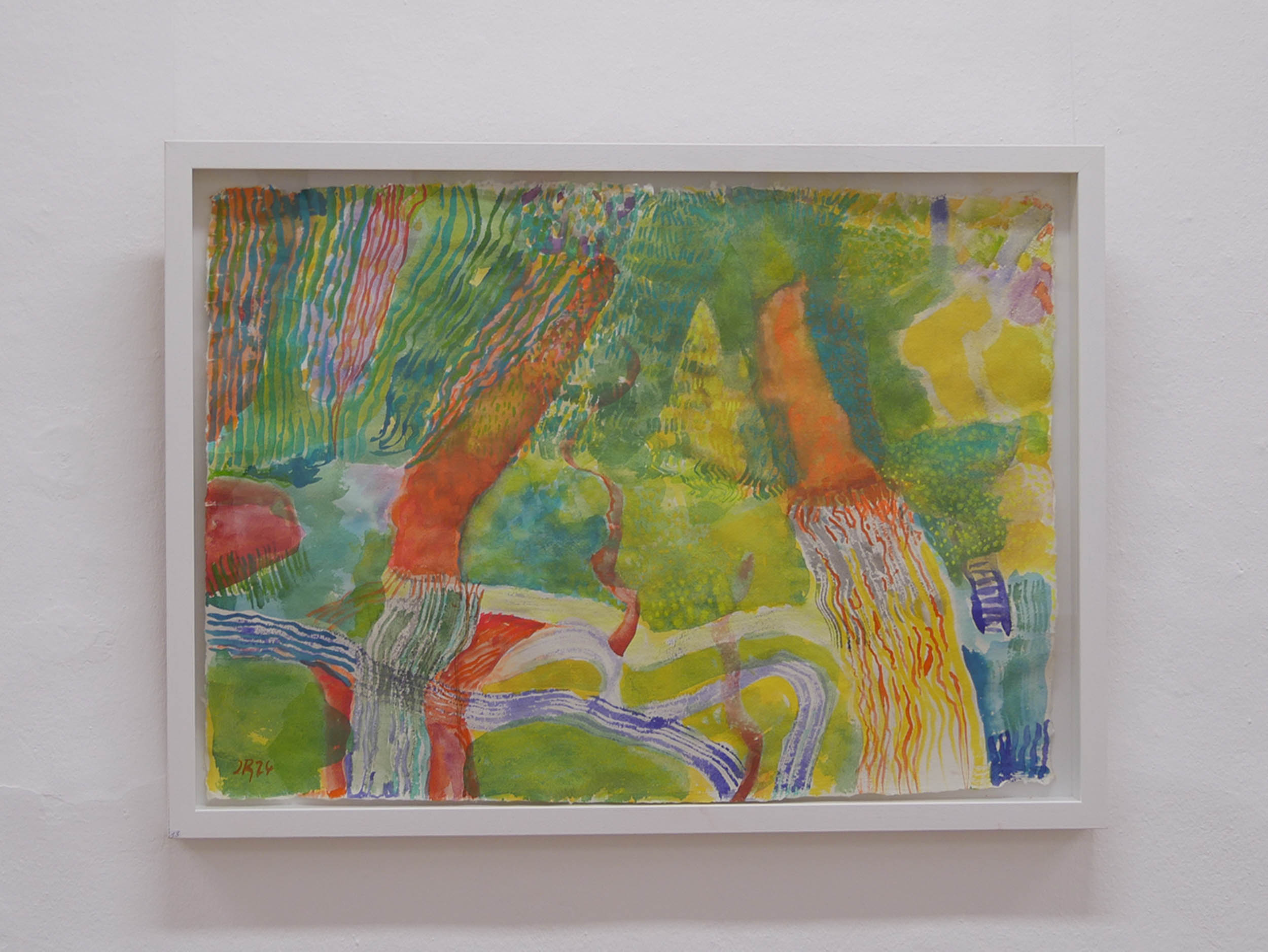 Wasser ist die andere Komponente des Aquarells, Dann kam die Ahrflut,  das Wasser als Bedrohung. Es entstanden Arbeiten in kontrastierenden , manchmal disharmonischen Blau-und, Rottönen. Und erstem punktuellem Einsatz Von grellen Tagesleuchtfarben.